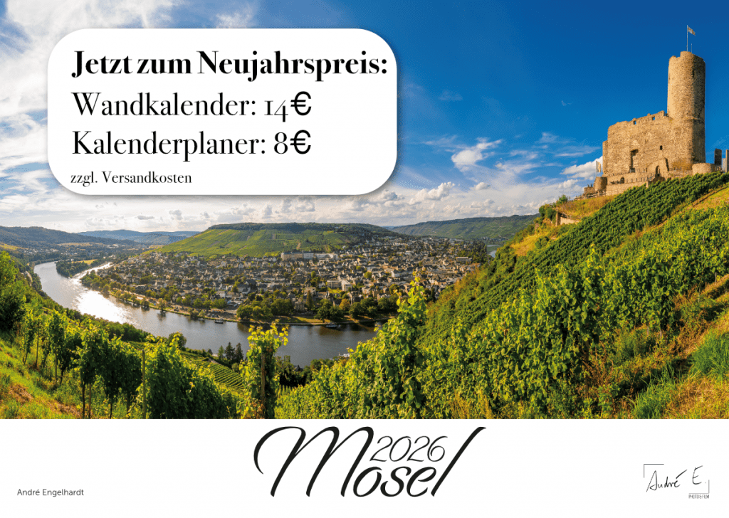 Meinen Mosel-Kalender 2026 jetzt zum Neujahrspreis von nur 14€ statt ehemals 18€, plus Versandkosten in der A3 Variante. Den Kalenderplaner gibt es jetzt schon für nur 8€ statt 9€.